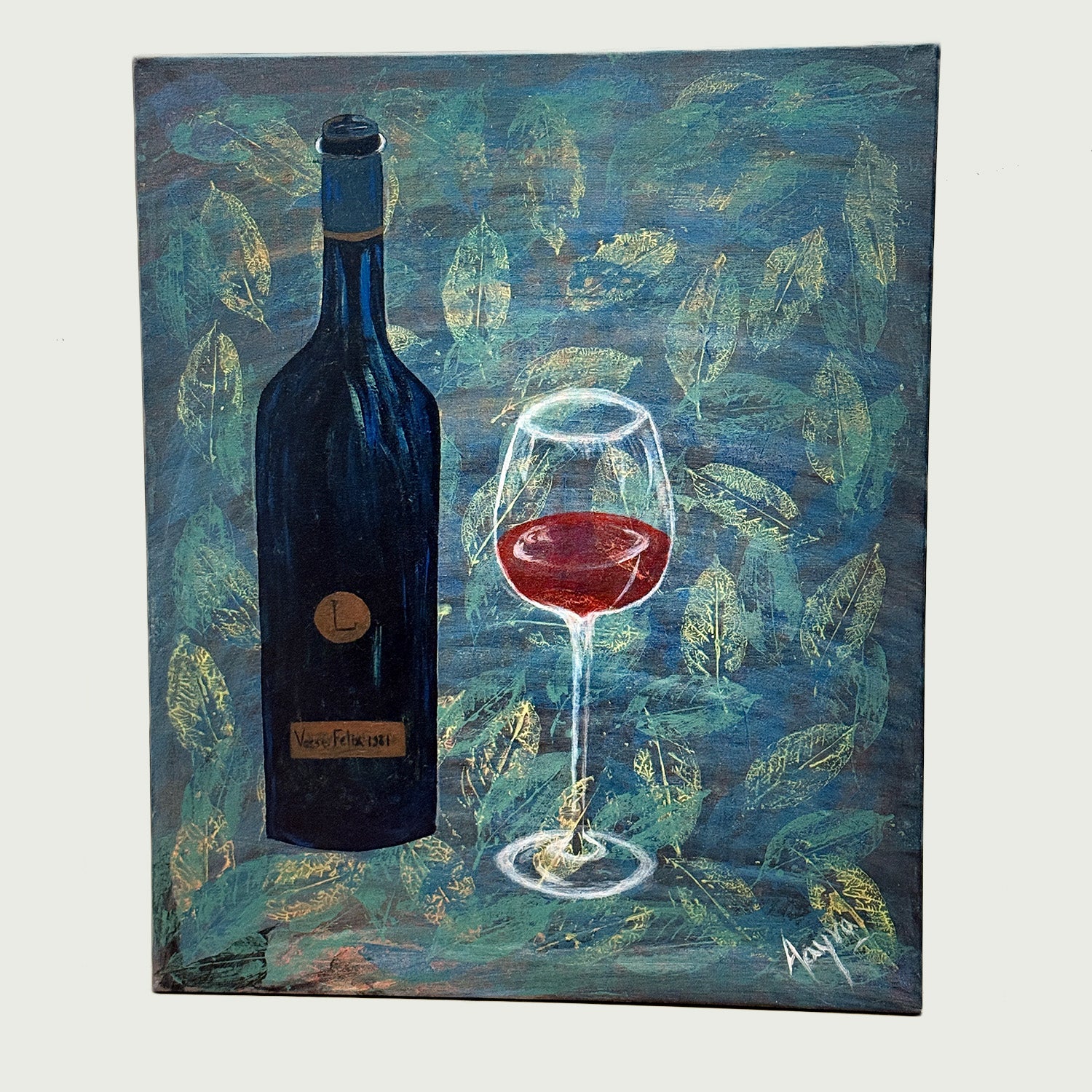 The bottle, tall and poised, symbolizes timeless sophistication, while the glass—half full with deep crimson—invites reflection and celebration alike. Behind them, golden leaves shimmer like memories pressed into time, evoking both heritage and the fleeting beauty of the present. Each brushstroke is intentional, layered to echo the mystery of a vintage waiting to be uncorked, a story waiting to be told.